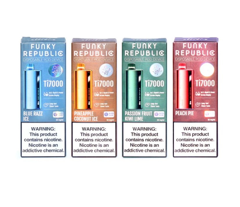 Made by ELFBAR, Funky Republic Ti7000 ( 7000 Puff ) Smart Disposable Device is an innovative disposable that features a liquid and battery life indicator display with long-lasting flavor and 12.8ml of 5%nic that lasts approximately 7000 puffs.