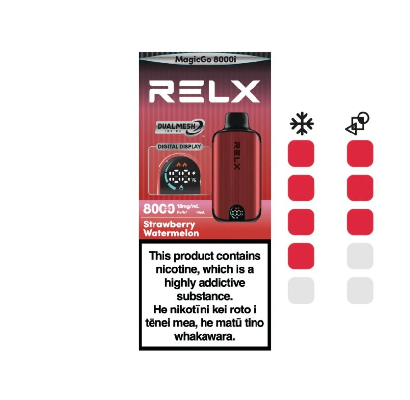 The RELX MagicGo 8000i Strawberry Watermelon is a premium option in disposable vapes, redefining convenience and style with advanced technology. Crafted by RELX Vape, the RELX MagicGo 8000i features a sleek metallic design that delivers both exceptional performance and elegance. This high-quality device, imported directly from RELX Vape to Australia & New Zealand, is perfect for those seeking a superior vaping experience.